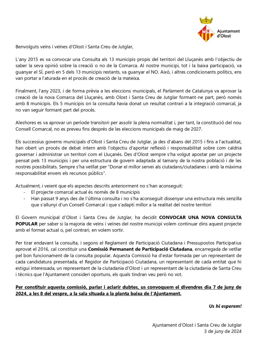 Us informem de la convocatòria d'una reunió per crear la Comissió Permanent de Participació Ciutadana.