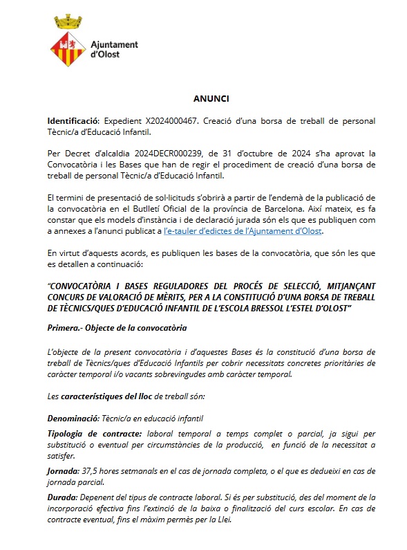 Convocatòria i bases de selecció d'una borsa de treball de Tècnic/a d'Educació Infantil a l'Escola Bressol Estel d'Olost
