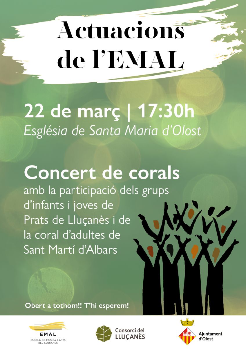 D'altra banda, el dissabte 22 de març a les 17.30h s'oferirà un concert de la Coral de l'EMAL a l'església de Santa Maria d'Olost.