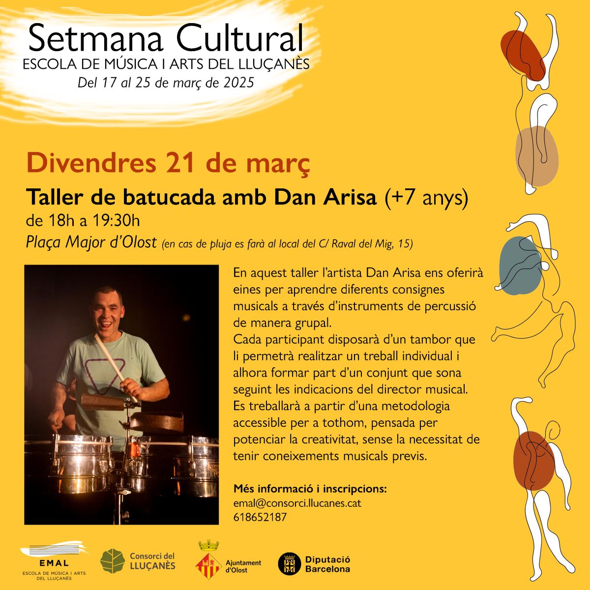 En el cas d'Olost el divendres 21 de març de 18 a 19h s'oferirà un Taller de batucada a la plaça major.