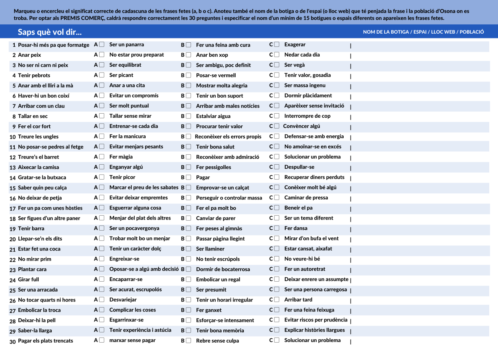 Cal que encerteu el significat de les 30 frases diferents i que indiqueu, com a mínim, 15 establiments on les heu trobat.