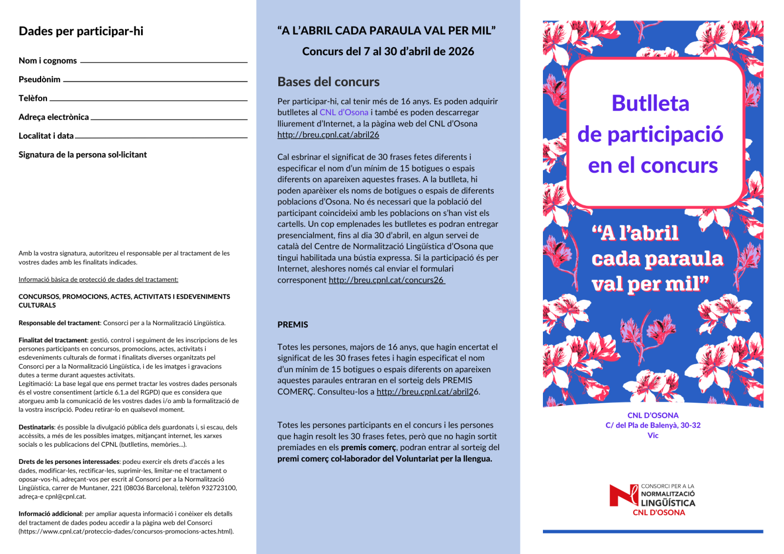 Un any més des de l'Ajuntament i la Biblioteca d'Olost col·laborem amb la difusió del català a través del concurs organitzat pel CPNL (Centre de Normalització Lingüística d'Osona), amb el concurs A L'ABRIL CADA PARAULA VAL PER MIL